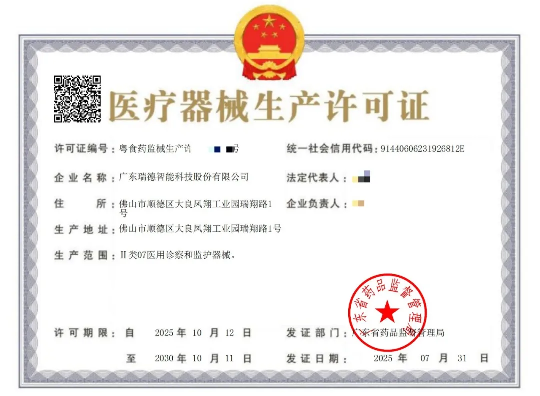 瑞德智能凭借卓越的质量管理体系和创新实力,于近日顺利通过广东省药品监督管理局的严格审查,成功获得医疗器械生产许可证延续认证,新证有效期至2030年(许可证编号:粤食药监械生产许20204058号)。这是对瑞德智能在医疗器械生产质量管理、技术创新及合规运营的又一次权威肯定!