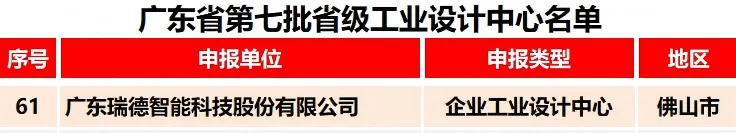 近日,广东省工业和信息化厅发布了关于第七批省级工业设计中心名单的通知,广东瑞德智能科技股份有限公司(股票代码:301135)凭借在智能控制器领域卓越的设计创新能力与产业化实力,成功通过广东省工业设计中心的认定(名单序列第61号)。