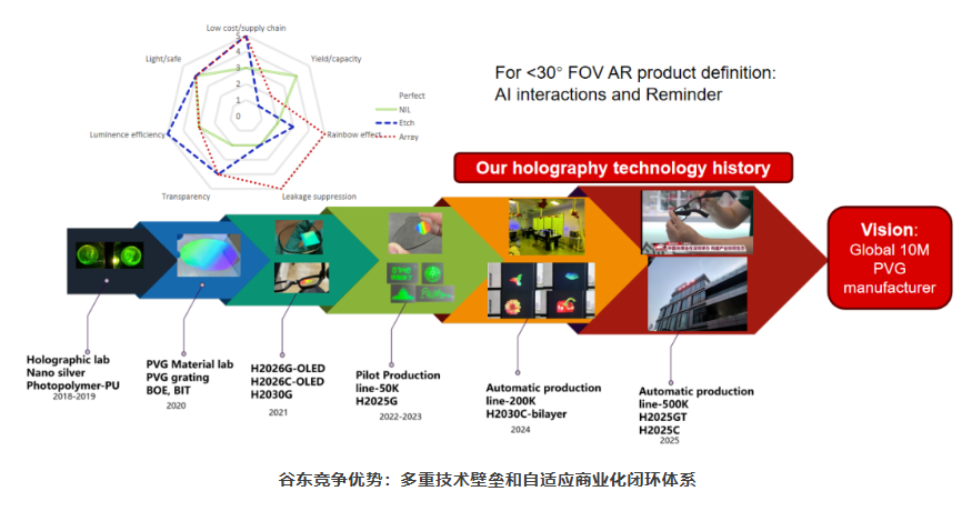 作为国内唯一同时掌握阵列光波导与体全息光波导全谱系核心技术,并具备从光学材料、精密模组到整机系统及AI算法全链条自主研发能力的企业,谷东智能在体全息光波导(PVG)领域实现了国产化重大突破,2025年全球首条20万片级PVG全息光波导12寸晶圆自动化产线搭建成功,同年全球首创喷墨打印局域光取向表面调控技术实现单层全彩PVG波导。其AR眼镜光学解决方案对于打破国外技术垄断、推动AR眼镜核心光学器件的国产化替代具有重要战略意义。